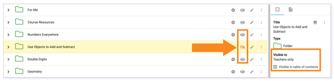 Clicking the eye icon in the Editor changes the visibility for the selected folder or activity. When a slash is shown through the eye, the folder or activity is visible to Teachers only. When no slash is shown, the piece is visible to students, teachers, and observers.
