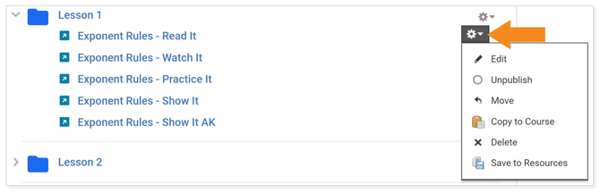 You can edit, move/reorder, and duplicate modules (Lessons) within Schoology. After opening a module, click the gear icon for a drop-down menu of options.
