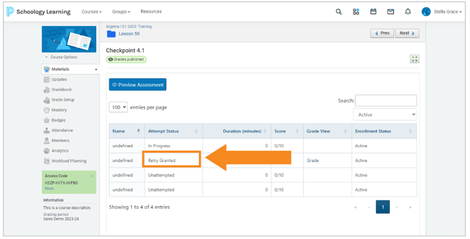 When grading an assessment in Schoology, you will have the ability to grant an individual student a retry on their assessment.