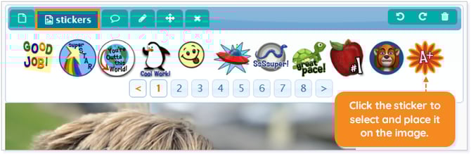 You can place predefined images/stickers on top of the student submission by navigating to the Stickers tab. Eight small pages of icons are available to be added to the student submission; these are updated several times per year.