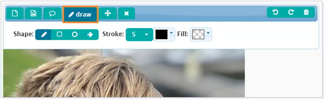 The Draw tab allows you to use a pencil to draw freeform lines. It also allows you to add a rectangle, circle, and arrow. The stroke size and color of your selected shape can be adjusted.