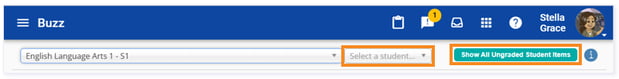Upon your course selection, a second dropdown will appear with the students in the course. You can Select a student from the dropdown, or you may Show All Ungraded Student Items.