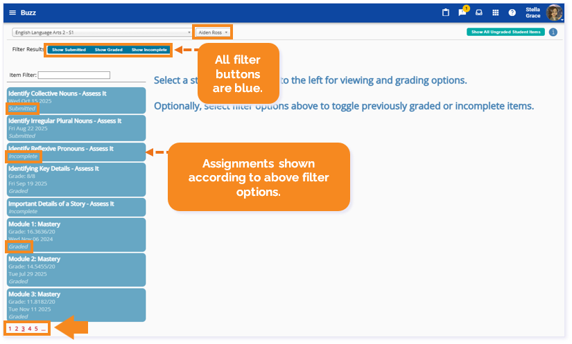 You can filter the results using the Show Submitted, Show Graded, or Show Incomplete buttons. Clicking the button will show specific items based on that filter option. You can reset, re-grade, or submit these items as well.