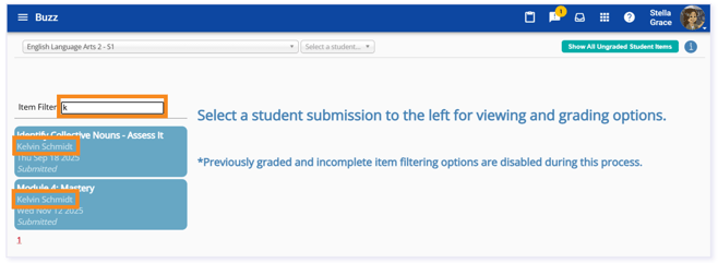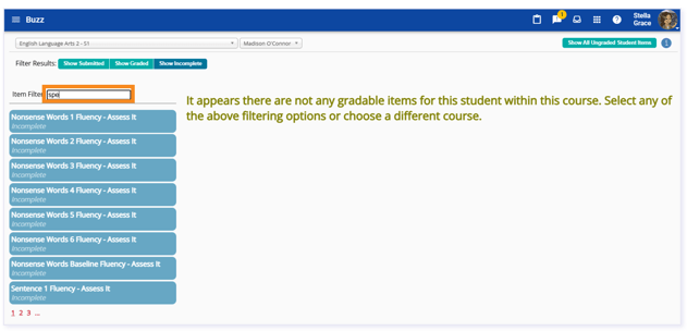 The Show All Ungraded Student Items button shows all ungraded items for a specific course and does not show previously graded or incomplete items. If you opt to Show All Ungraded Student Items, the Show Graded and Show Incomplete filters will be disabled.
