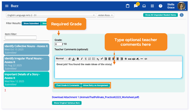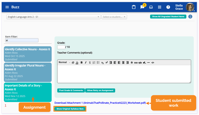 After you choose the course and student, you will see the list of submitted assignments appear on the left. Upon selecting a student assignment, you will be presented with locations to add the Grade (required) and optional Teacher Comments, a student work submission section, and a button to Show Original Syllabus Items.