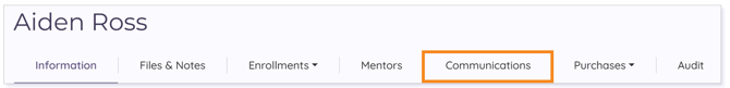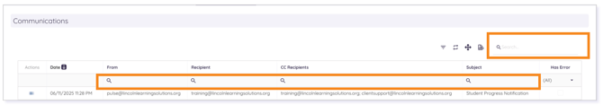 The user’s Communications log displays. Use the search tools to locate specific information.
