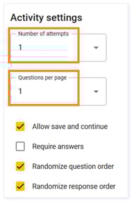 - Randomization: These two checkboxes help to ensure students are getting a different question order with a different response order.
