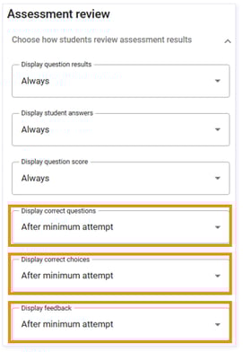 The Assessment review is where you choose how students review assessment results. By default, all options are set as Always.