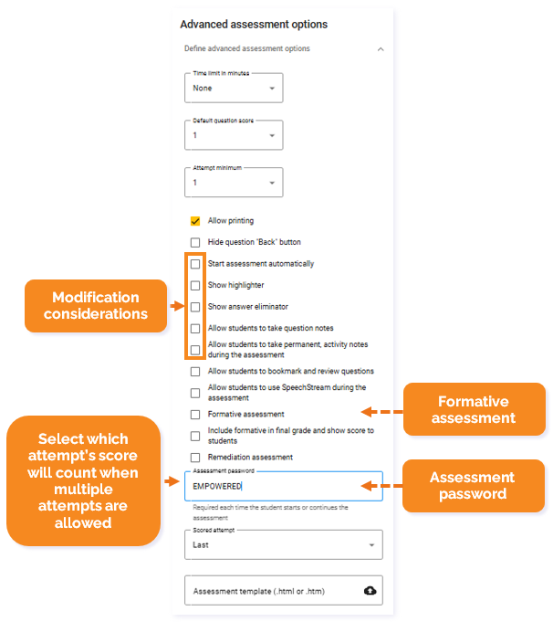 The Advanced assessment options tile allows you to add or disable features for your students’ assessments.