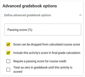 In the Advanced gradebook options, Lincoln Learning defaults to checking Score can be dropped from calculated course score and Include this activity’s score in final-grade calculation.
