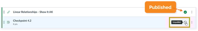 Lincoln Learning assessments are able to be published and unpublished as needed for Canvas users. Online and upload assessments are called assignments in Canvas. On the right end of each item, click the checkmark to unpublish or the circle with a line through it to publish assessments.Buzz