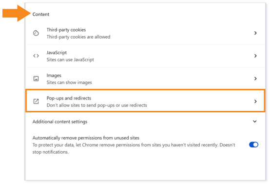 Scroll to the Content section. Then, click Pop-ups and redirects.