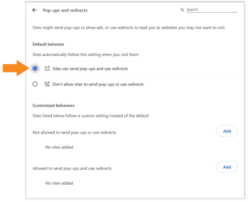 Under Default Behavior, select Sites can send pop-ups and use redirects.
