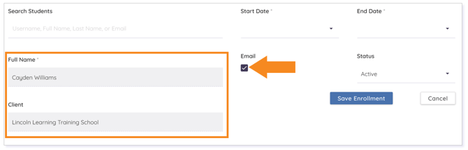 The enrollment form displays. Begin to type the student’s Username, Full Name, Last Name, or Email into the Search Students field. Then, select the appropriate student from the drop-down menu.
