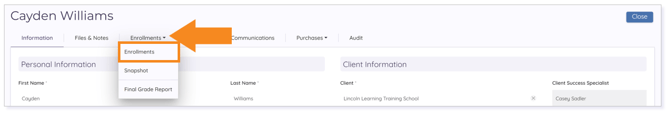 The student’s Information record displays. Click the Enrollments tab. Then, select Enrollments from the drop-down menu.