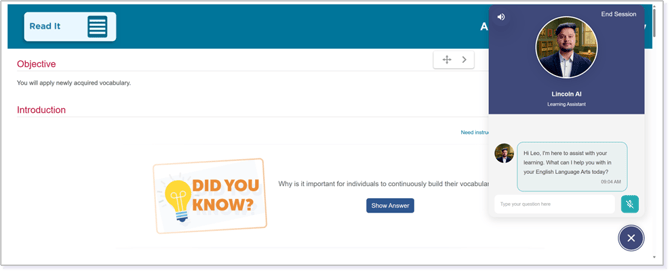 Lincoln Learning Solutions (LLS) has partnered with Creatium to create an innovative AI learning assistant for LLS Empowered clients to enable for student enrollments. The Learning Assistant uses the learning object to refer students to the content within the object they are viewing. It can point to aspects of the lesson for review and remediation.