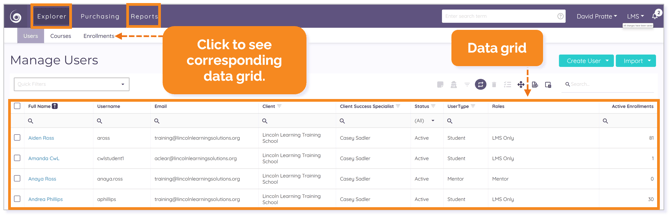 Click Users, Courses, or Enrollments to see the corresponding data grid.