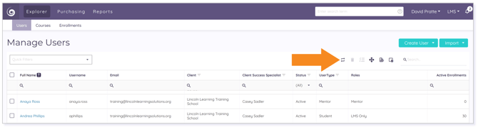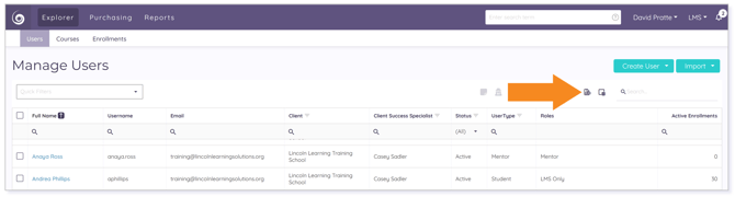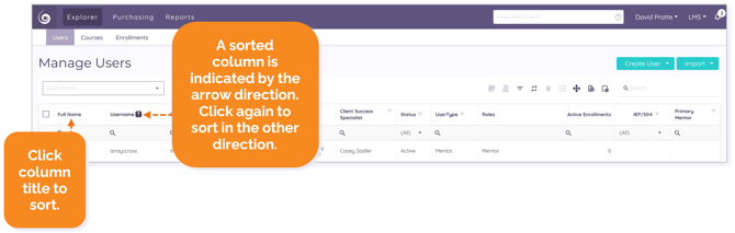All columns in Explorer within the Users, Courses, and Enrollments tabs can be sorted in either ascending or descending order by clicking on the column title, which arranges elements in the sorted list alphabetically (i.e., A to Z for ascending order, Z to A for descending order) or numerically (i.e., lowest to highest for ascending order, highest to lowest for descending order).
