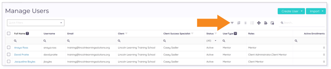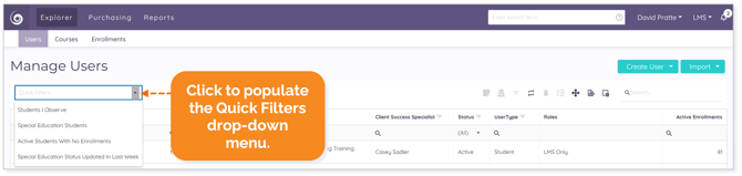 To quickly filter a Users, Courses, and Enrollments data grid, use the Quick Filters tool and select an option from the drop-down menu.