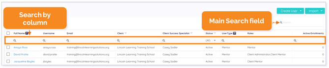 You can search in the Users, Courses, or Enrollments tab by using the main Search field or by searching per column.