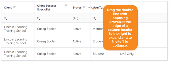 To expand a column, hover over the column header and move your mouse to the right edge of the header until you see a double line with an arrow pointing outward in either direction. Then, drag the header to the right until the column expands. To collapse the column, drag the header to the left.