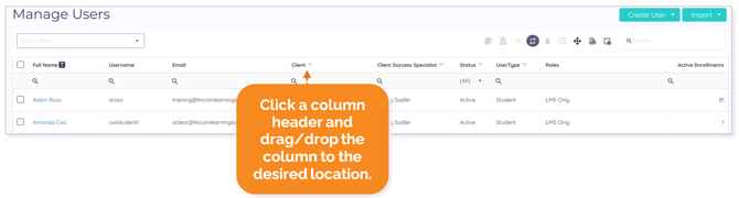 To rearrange a column, click any column header, drag it to your desired location on the grid and drop it.
