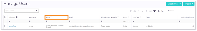 NOTE: Filtering options are different within Users, Courses, and Enrollments. This example shows filtering options within Users.