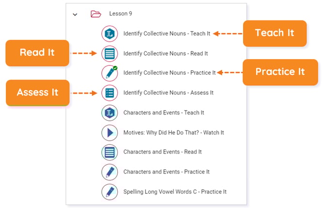 Navigating to the course Activities, you will notice there are three learning objects prior to the Assess It: