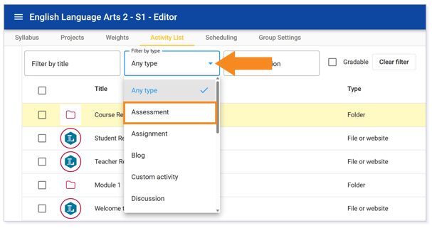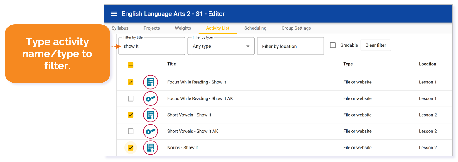 Bulk Edit is available in the Activity List tab within a course’s Editor. This feature allows teachers to select multiple components from the course syllabus and use the Bulk Edit icon to apply changes to all selected items at once.