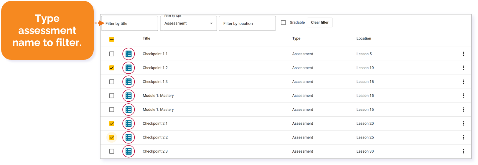 Use the Filter by title to locate your items you want to make gradable. Check all items you need to adjust.