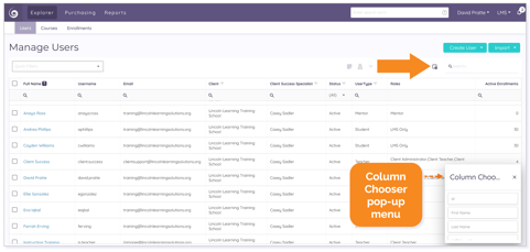 All columns in Explorer within the Users, Courses, and Enrollments tabs can be sorted in either ascending or descending order by clicking on the column title, which arranges elements in the sorted list alphabetically (i.e., A to Z for ascending order, Z to A for descending order) or numerically (i.e., lowest to highest for ascending order, highest to lowest for descending order).