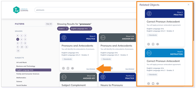 Clicking See related will populate a list of resources similar to the topic or subject matter in a new pane on the right.