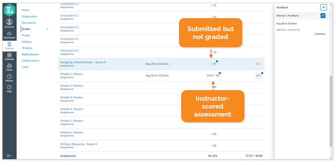 As a student, you can see your submissions and grades in a number of places. See the information below for where you can access grade information and the nuances of each view.