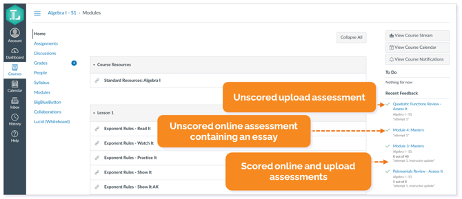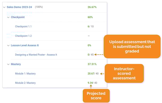 IMPORTANT: Upload assessments will show as a projected score of 0 until graded by the teacher.